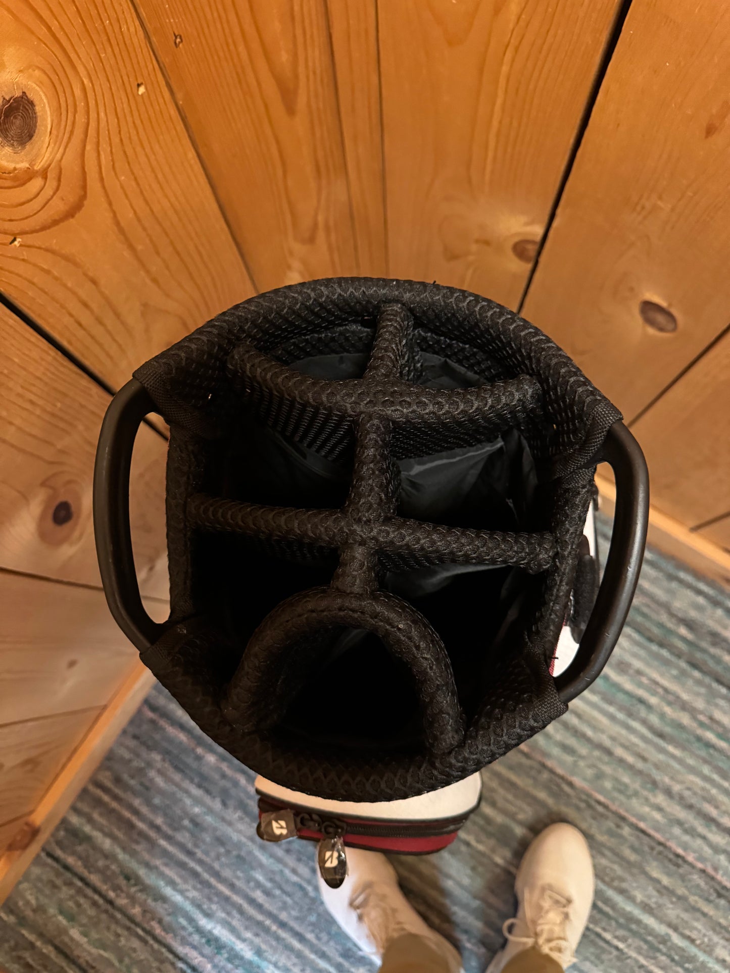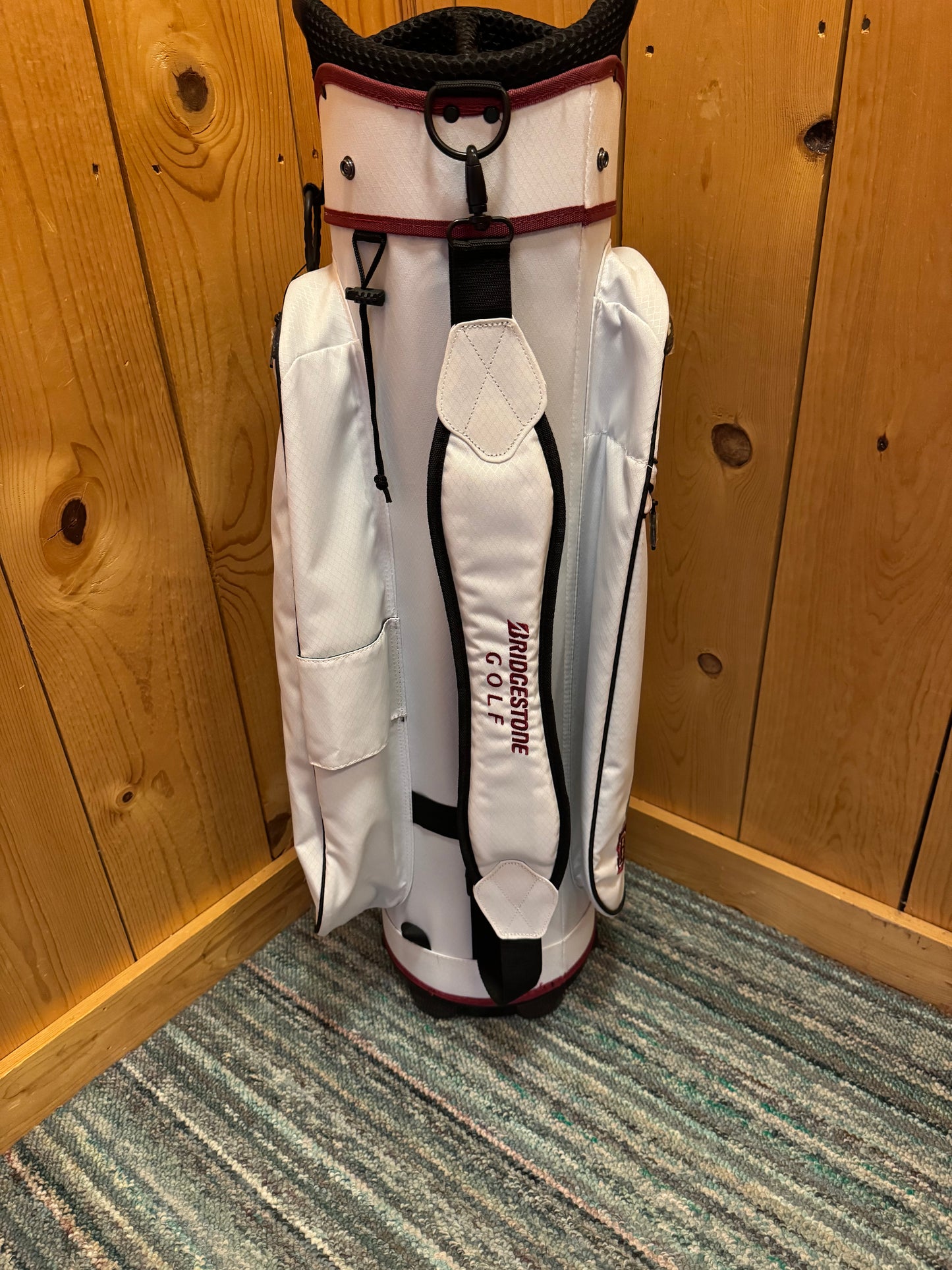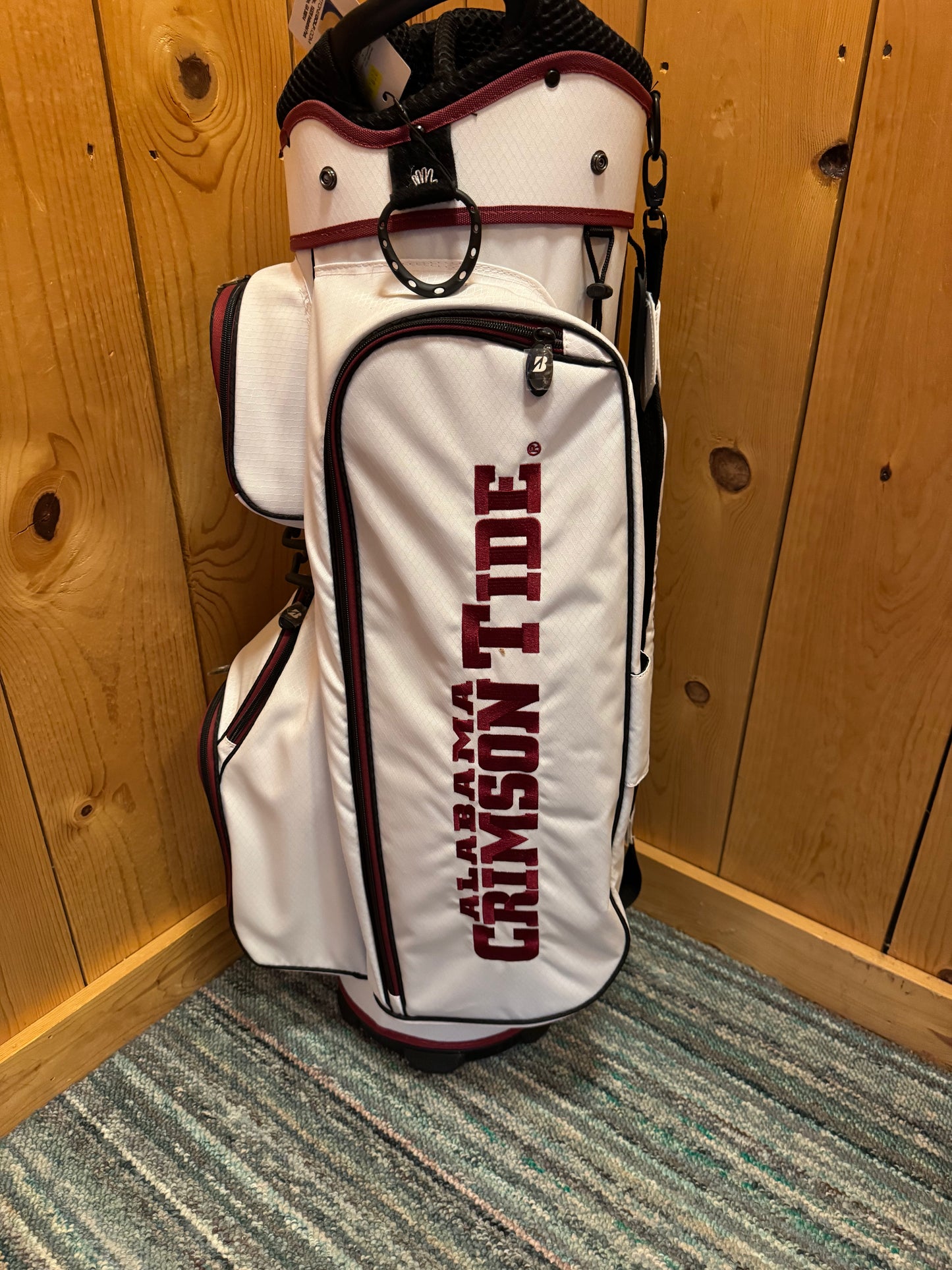 Alabama Crimson Tide Cart Bag, 7 slot bag. Features the various logos of the Alabama Crimson Tide. Great quality. 6 pockets are featured on the bag. 3 on the front, 1 on the right side, and 2 on the left, and the bottom left one is a cooler pocket where the logo of "Big Al" is. This bag also features a place to keep two golf balls locked in outside the bag.