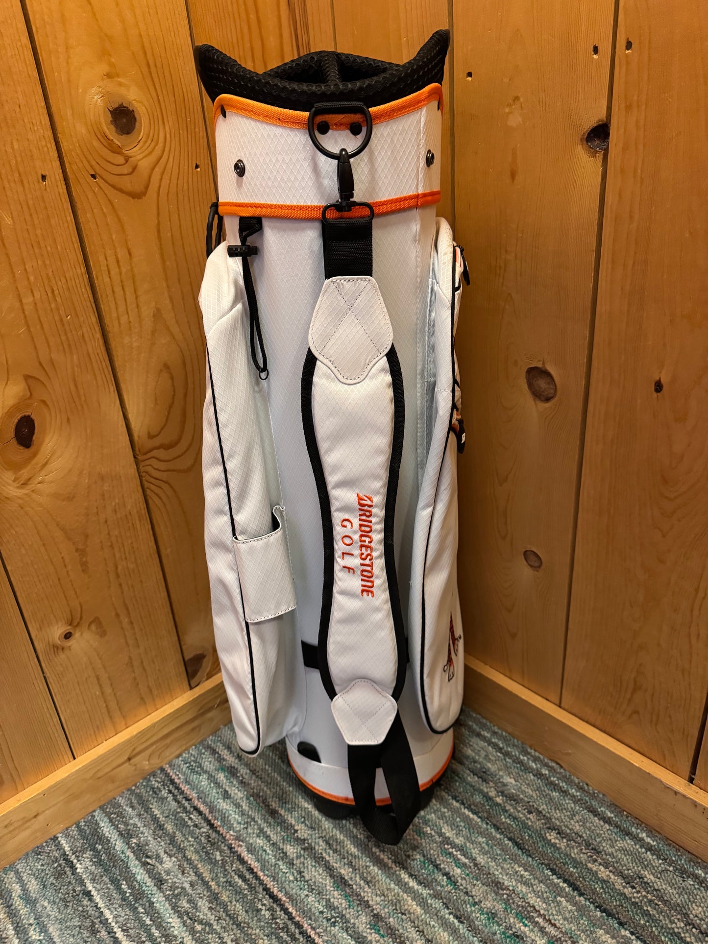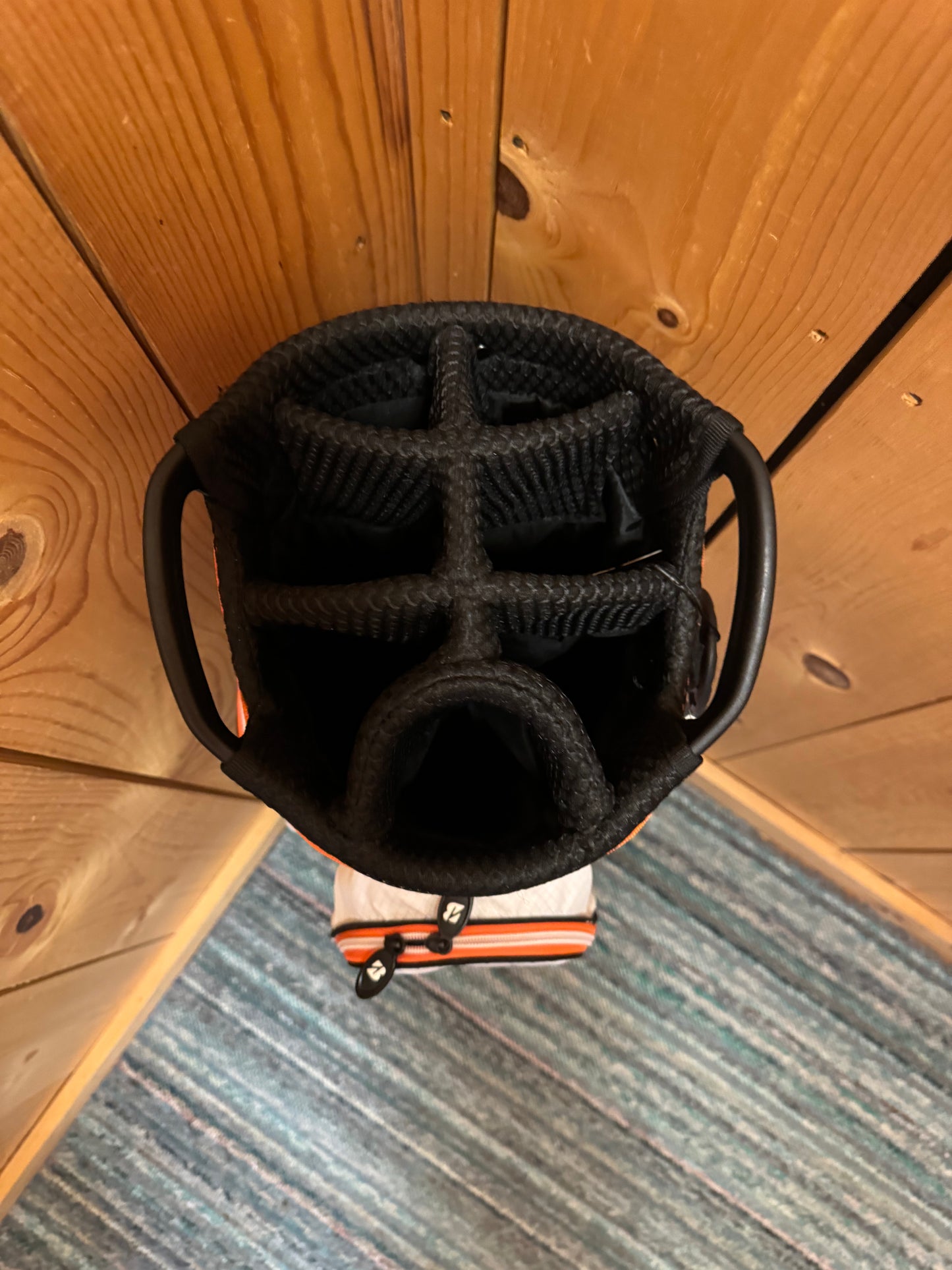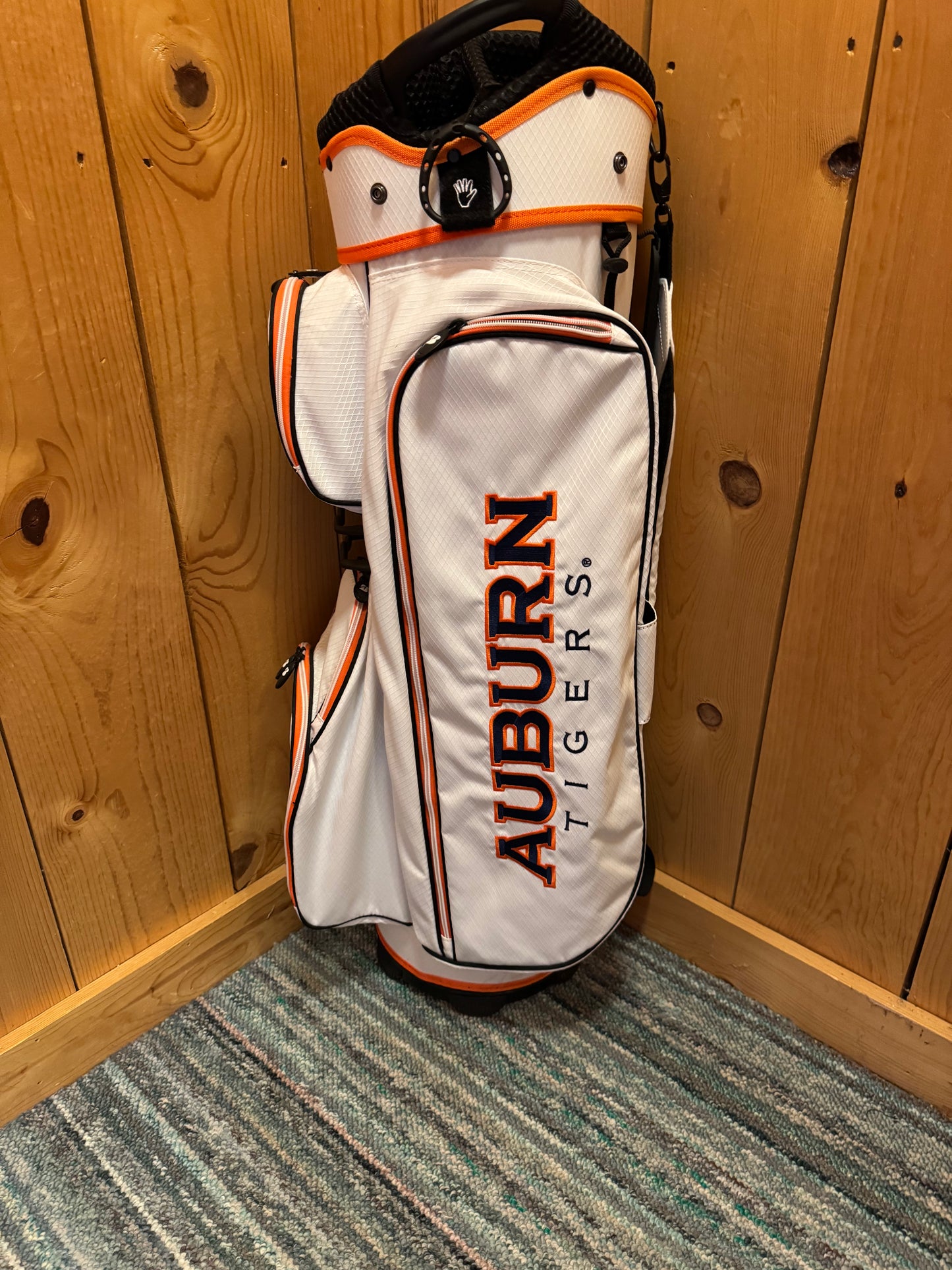 Auburn Tigers Cart Bag, 7 slot bag. Features various logos from the Auburn Tigers. Great quality. 6 pockets are featured on the bag. 3 on the front, 1 on the right side, and 2 on the left, and the bottom left one is a cooler pocket where the logo of "Aubie" is. This bag also features a place to keep two golf balls locked in outside the bag.