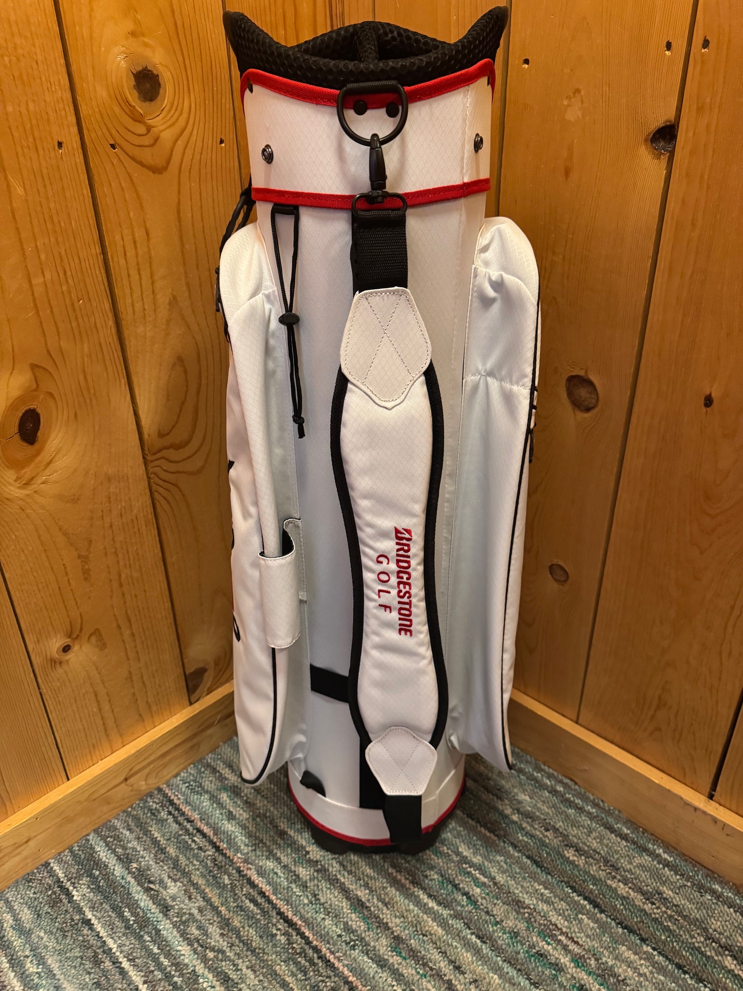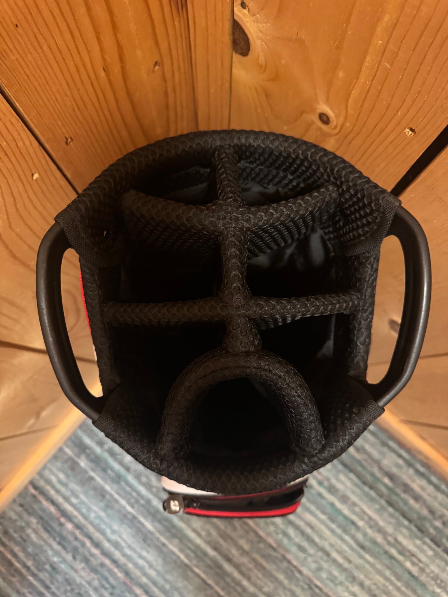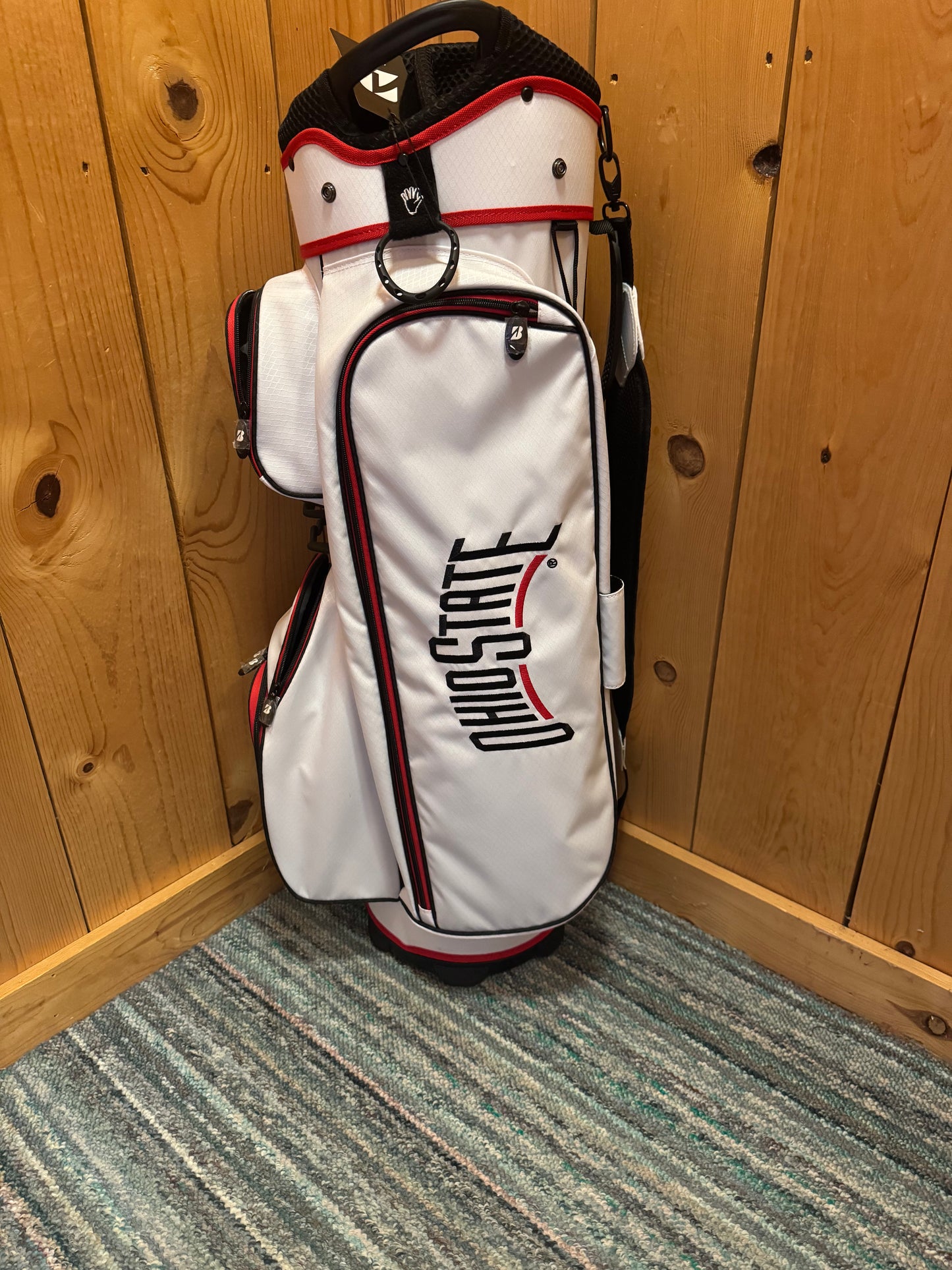 Ohio State Buckeyes Cart Bag, 7 slot bag. Features various logos from the Ohio State Buckeyes. Great quality. 6 pockets are featured on the bag. 3 on the front, 1 on the right side, and 2 on the left, and the bottom left one is a cooler pocket where the "O" logo is. This bag also features a place to keep two golf balls locked in outside the bag. O-H!