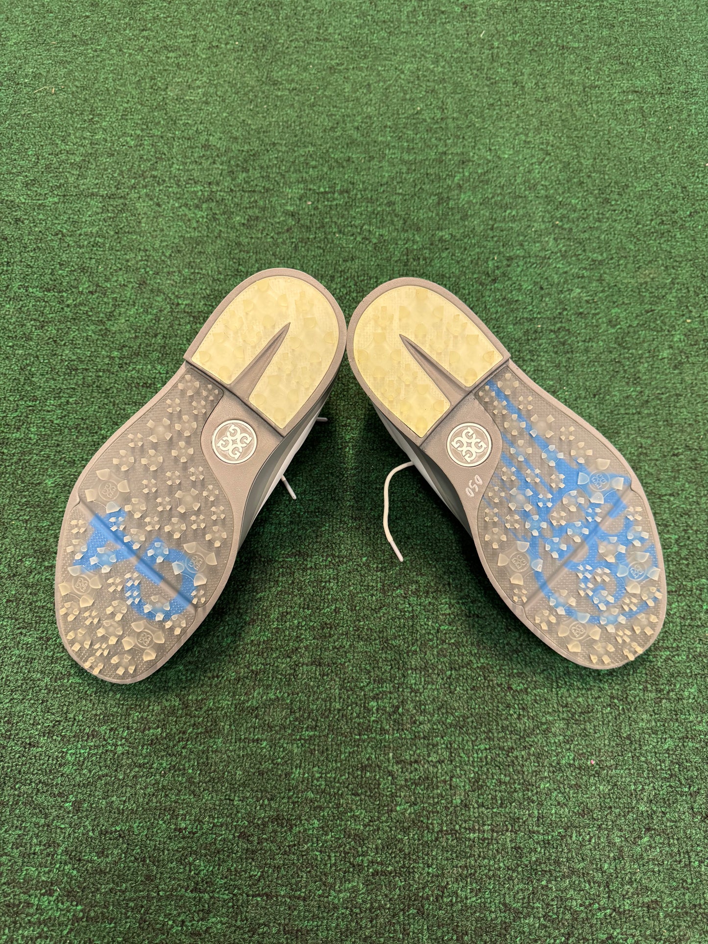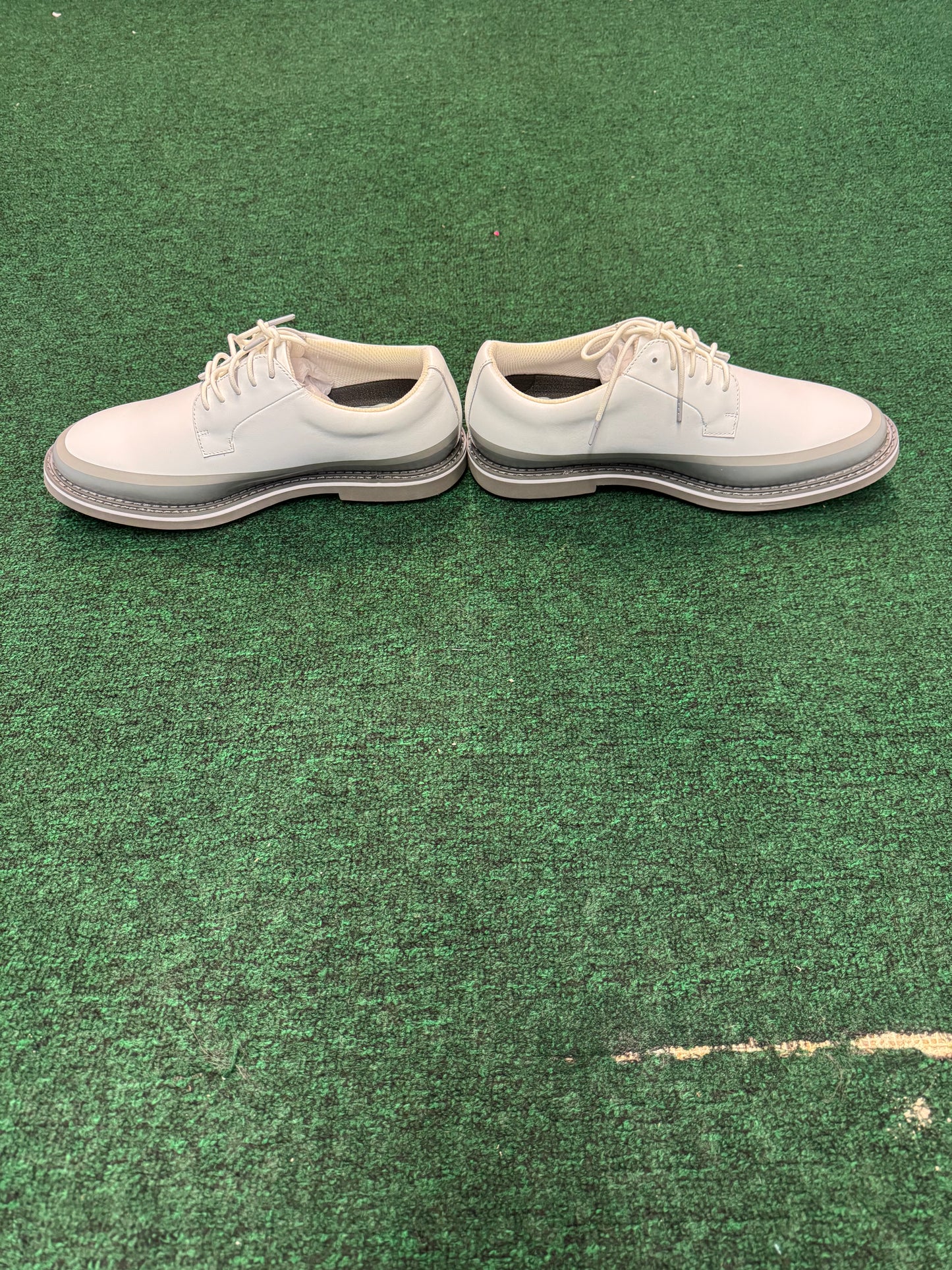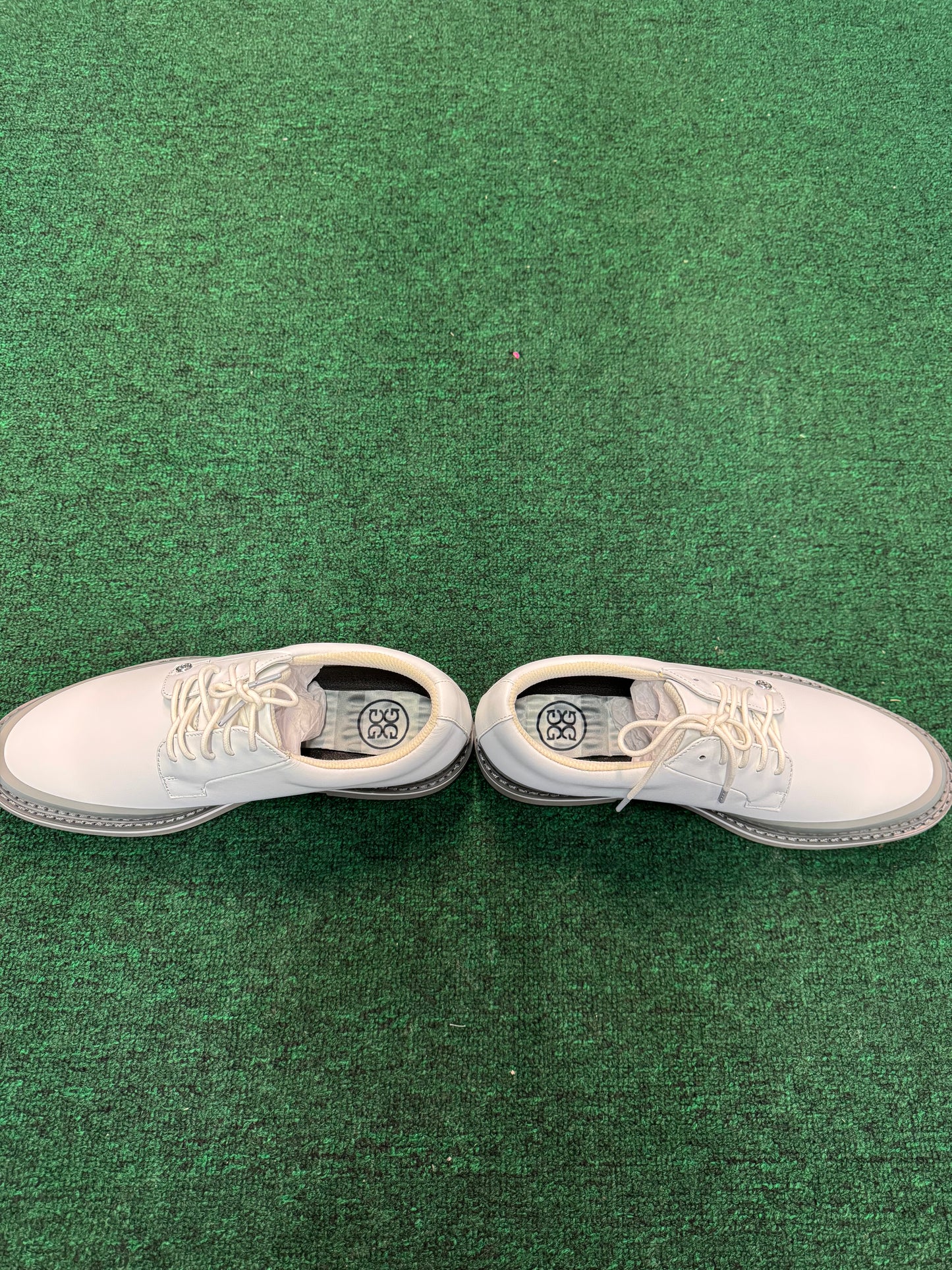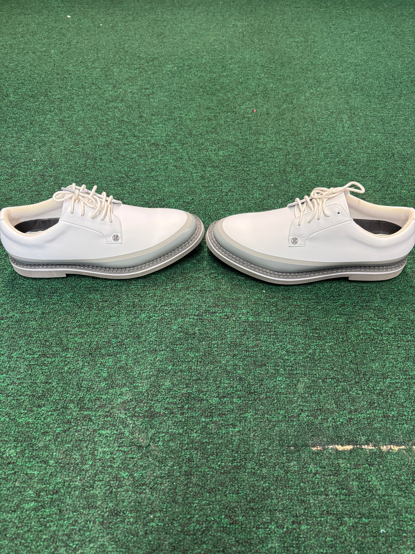 Original G Fore Tuxedo Gallivanters. Spikeless. Size 9. White base color with grey rings around the bottom of the shoe. These are brand new in the box. They have never been worn before. They also come with an extra set of white shoe laces.
