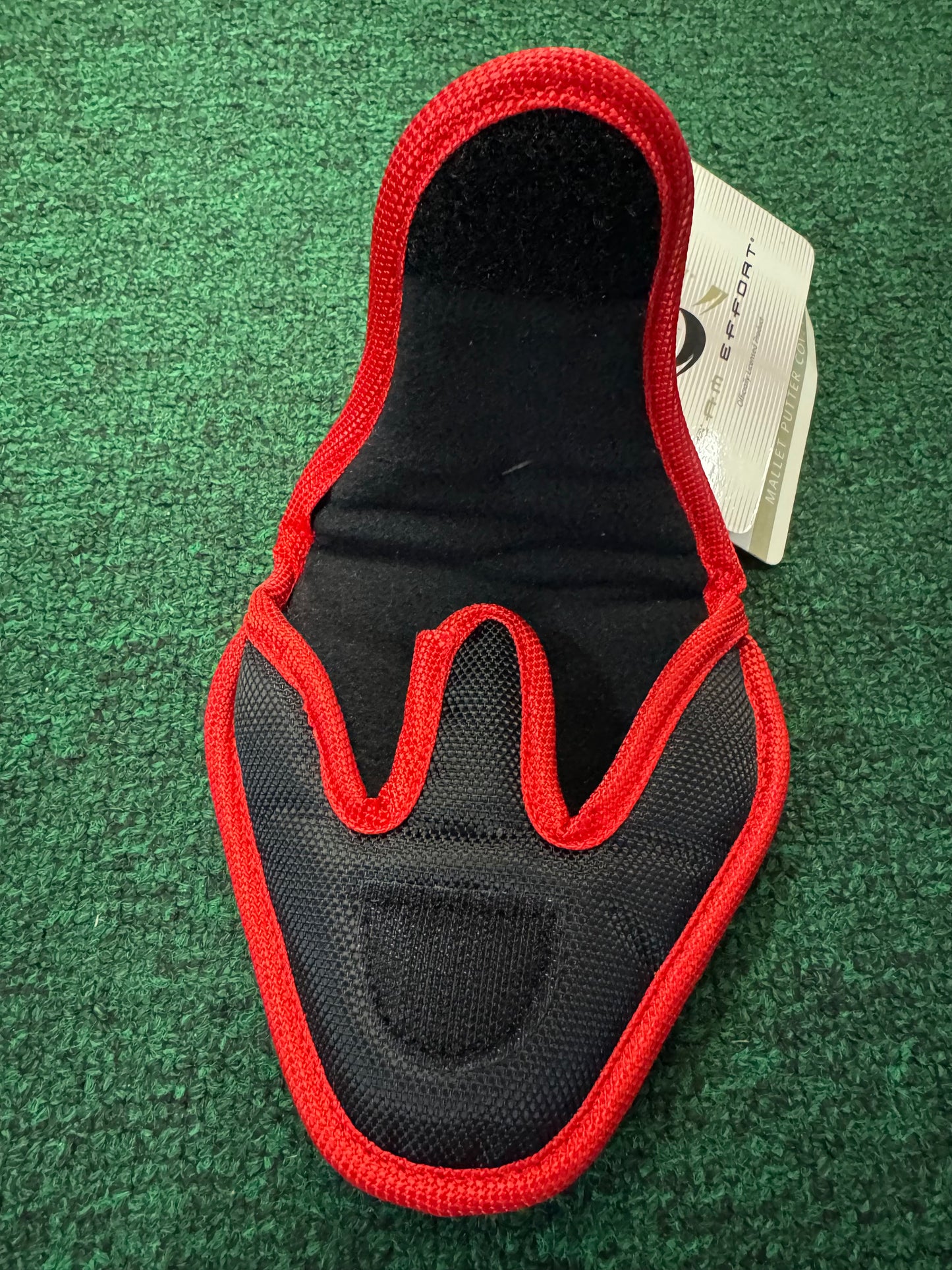 Maryland Terrapins putter cover. Velcro clasp. Black and red in color featuring the Maryland Terrapin's logo. This fits most 2-ball putters. This can also fit most half-mallet putters. You could squeeze some mallet putters, but it would be a tight fit.