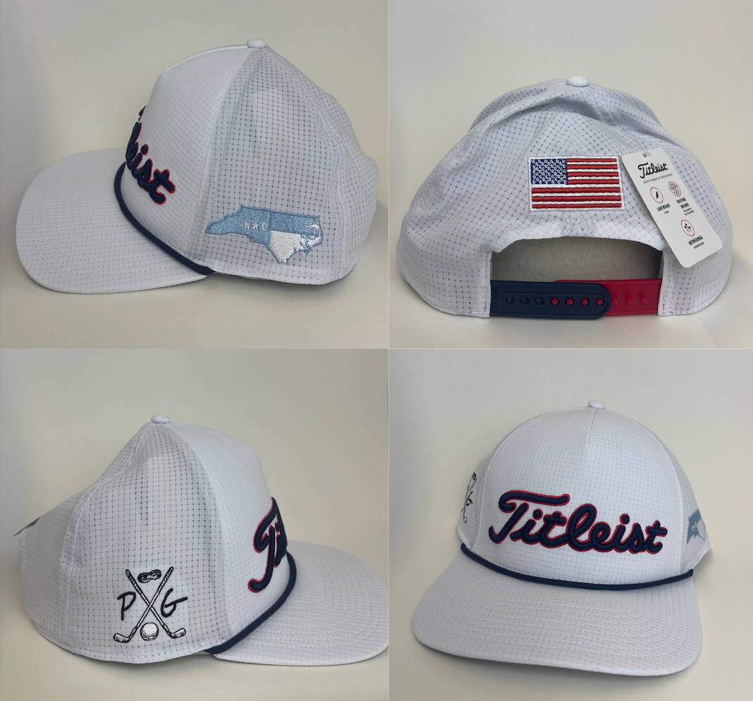Peanuts and Golf meets Titleist. The Titleist Tour Rope hat is now here with our infamous Peanuts logo. But that's not all, the hat also contains the North Carolina state flag, as well as the flag of the United States of America on the back. This lightweight, breathable hat is truly unique and can only be found here at Peanuts and Golf!